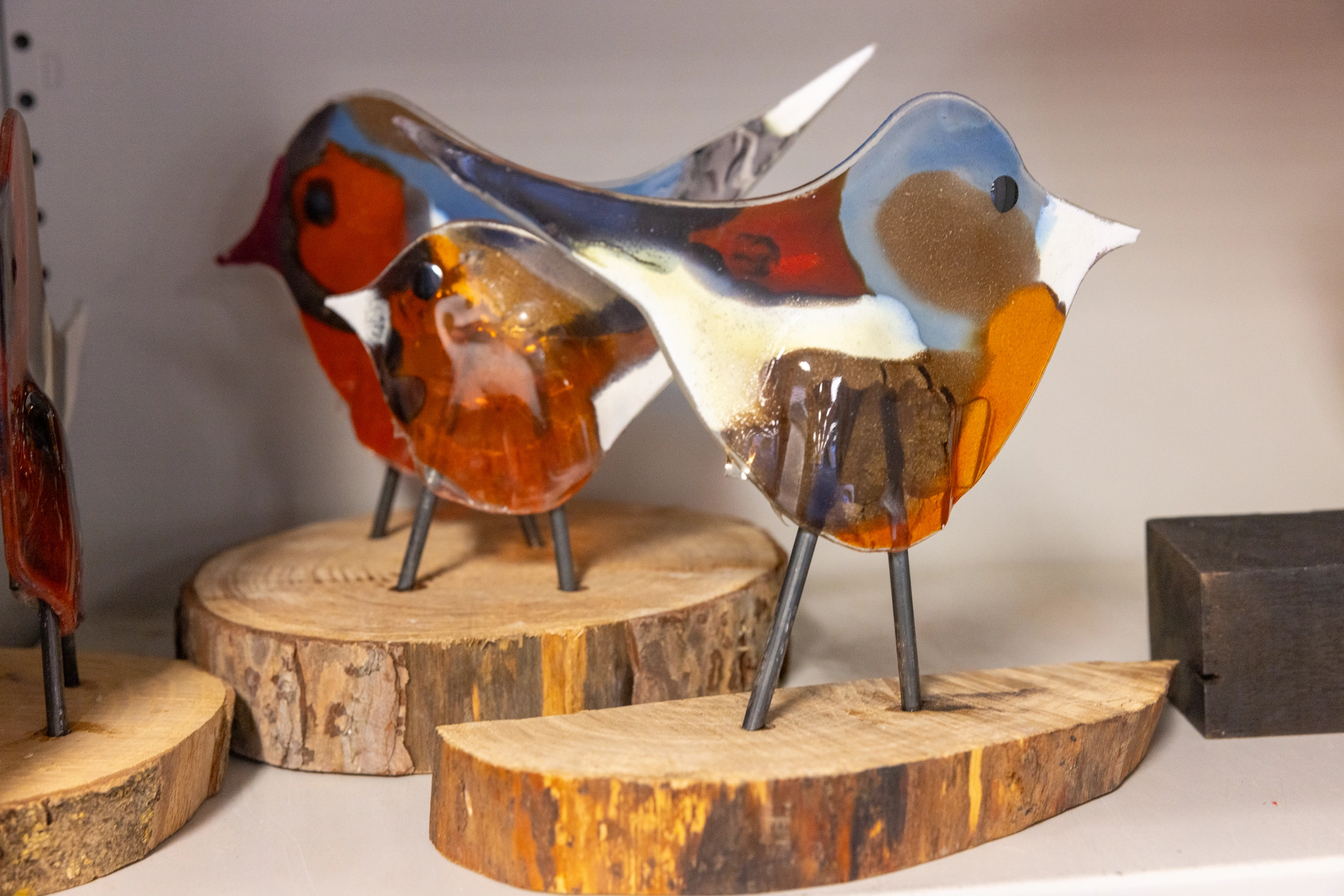 Sommige schilderijen staan inmiddels klaar om naar de Cacaofabriek vervoerd te worden. Zoals de mooie, kleurige schilderijen van Michelle en Anke. Maar nog niet alles is klaar. Aan een van de werktafels is Bas nog druk bezig met zijn Spiderman. “Die is gemaakt van papier-maché”, zegt hij terwijl hij met een zwarte stift de details op de grote pop aanbrengt. Een tafel verderop is Sander geconcentreerd aan het werk. Hij maakt een kleurige kerstboom met glasfusion. “Ik spuit verf op deze glasplaat en daarna wordt het gebakken.” Ook Marjan is aan de slag met glasfusion. Maar ze wil graag laten zien dat ze ook andere dingen maakt. “Ik vind breien en borduren leuk. Kijk maar eens wat ik allemaal gemaakt heb.”